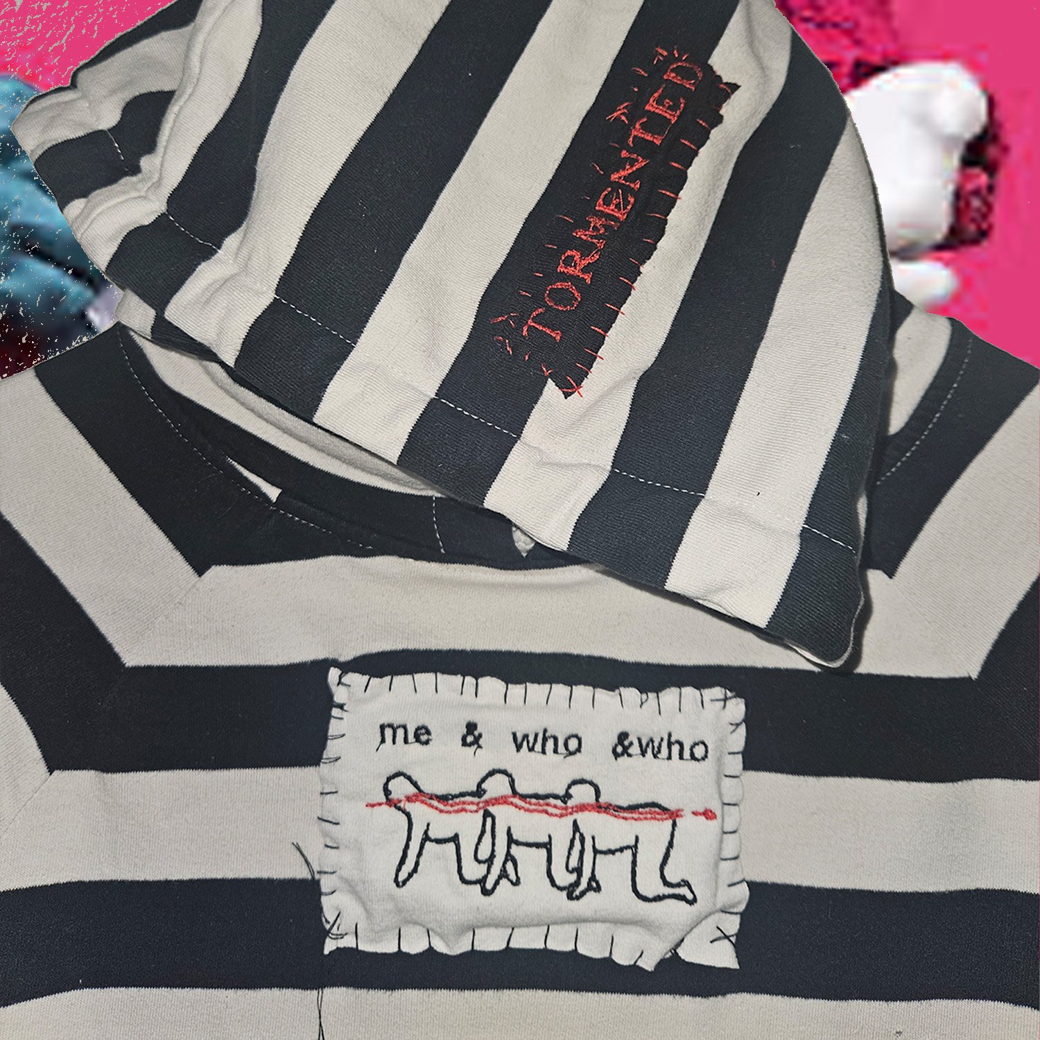embroidered me & who & who patch smack in the middle , tormented patch on the hood, sick fuck patch on the back, cropped and pin shut at the pocket <3