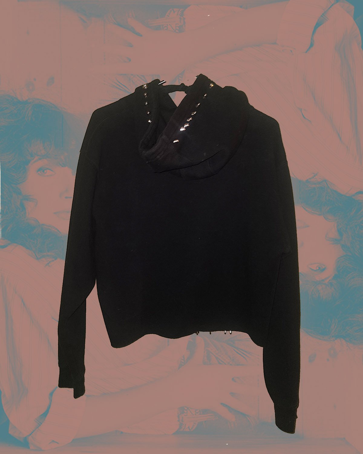 black on white kate patch sewn onto a black hoodie w/ some safety pins