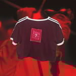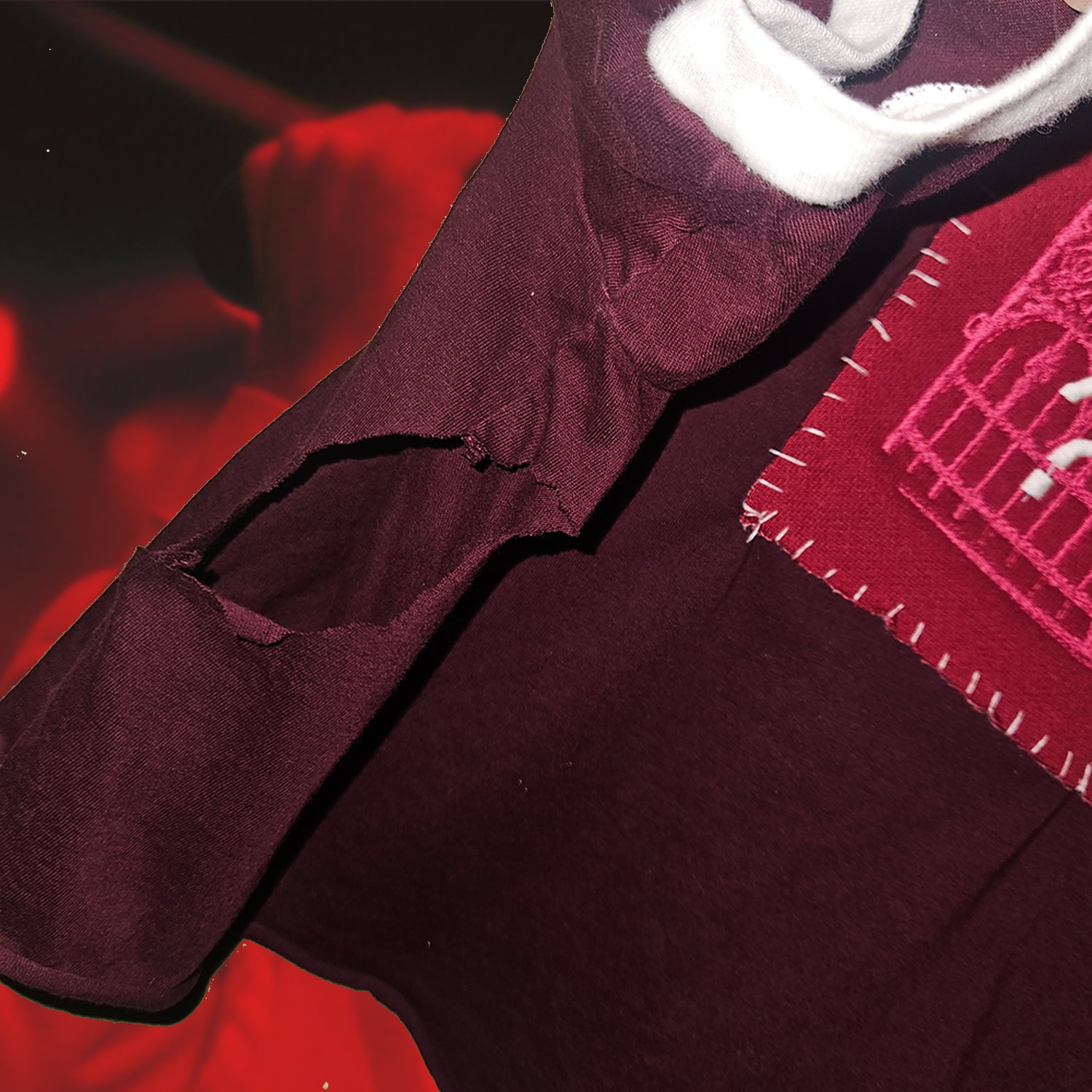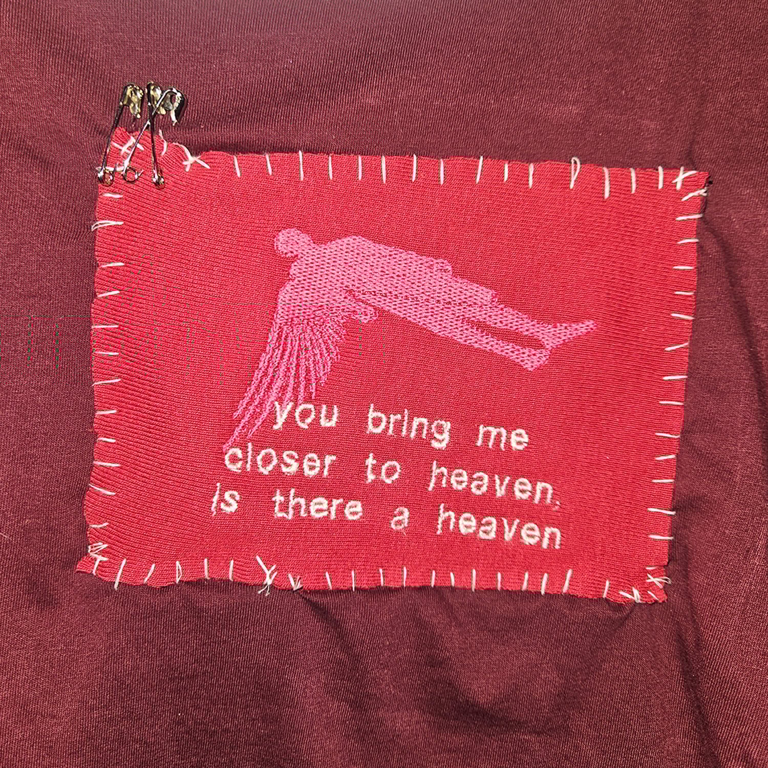 maroon adidas tee w stripe sleeves w embroidered patch on front silhouette of angel w txt "you bring me closer to heaven is there a heaven"