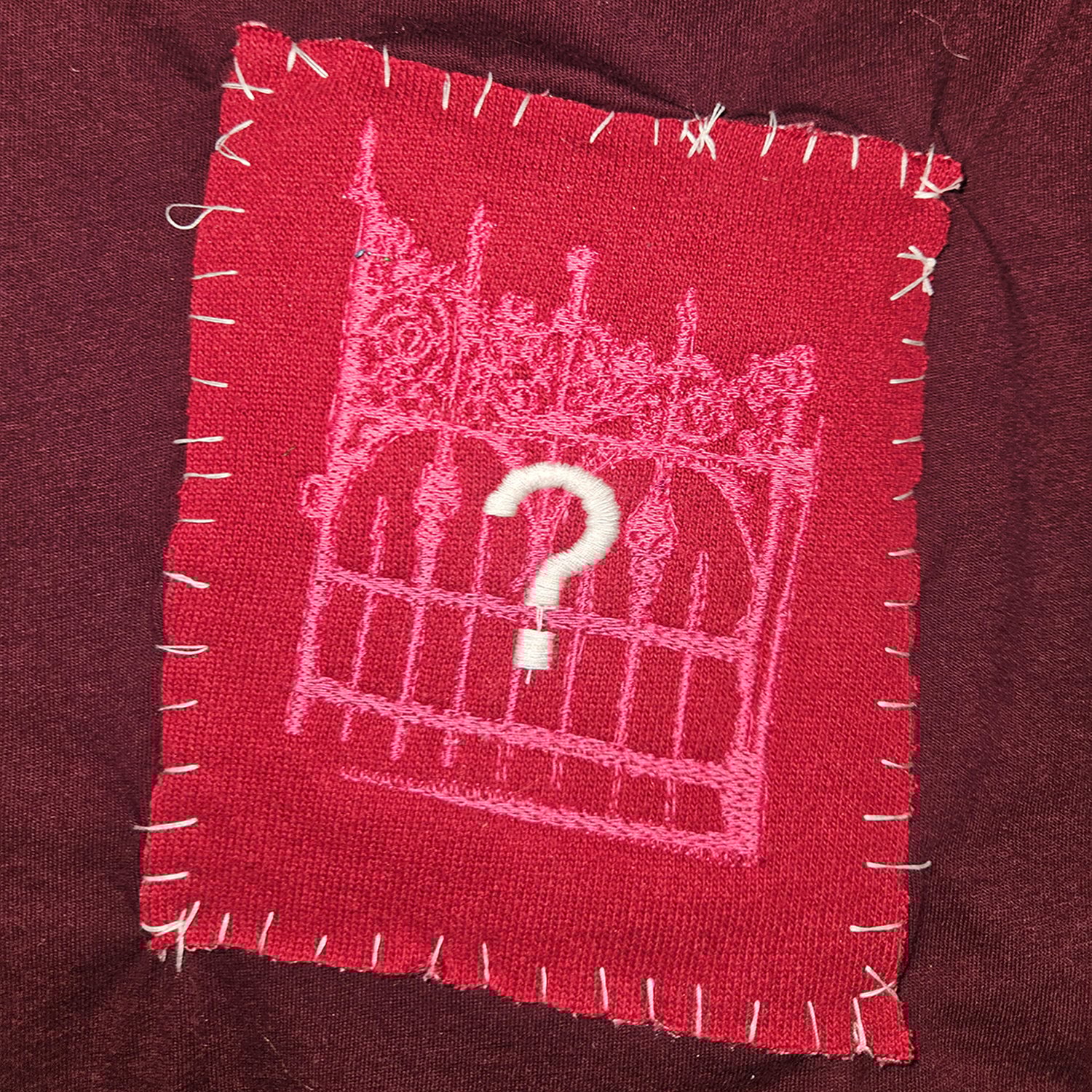 embroidered patch on back of gate w question mark layered over